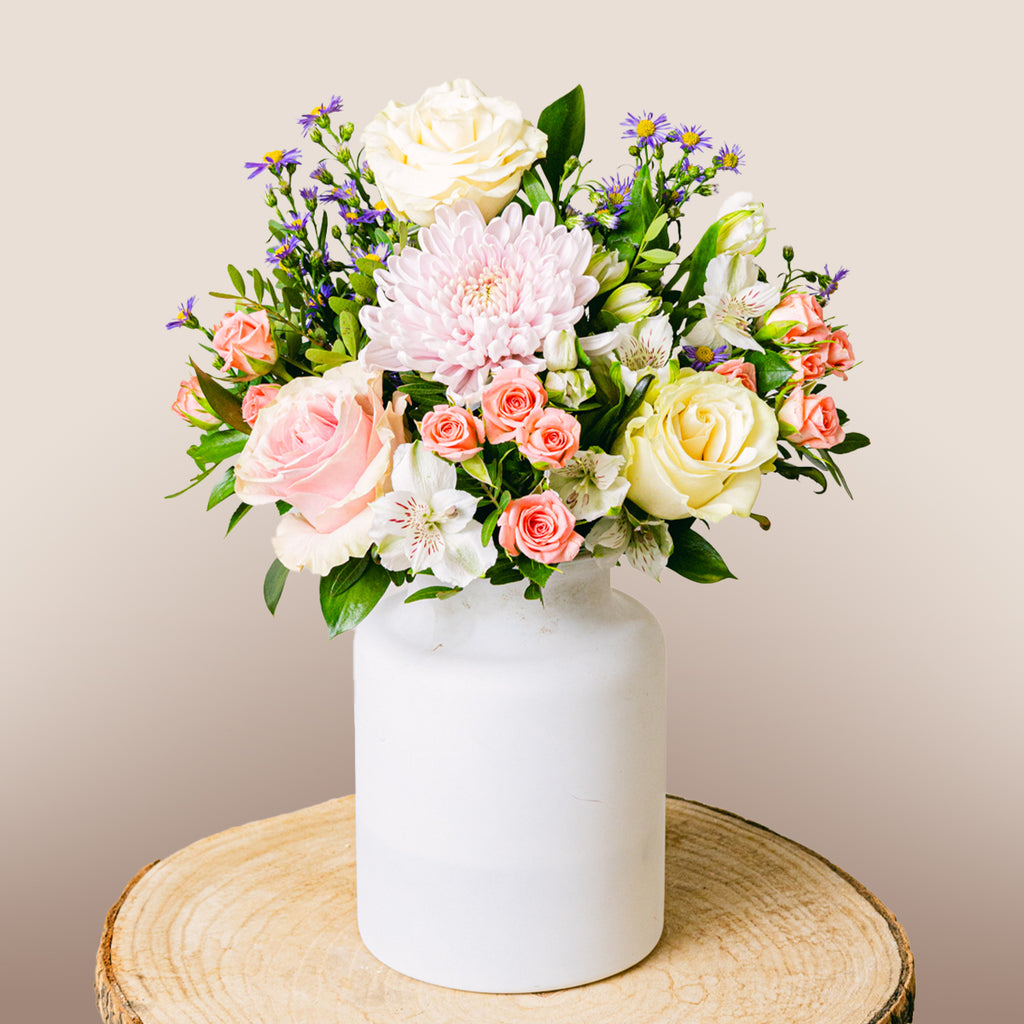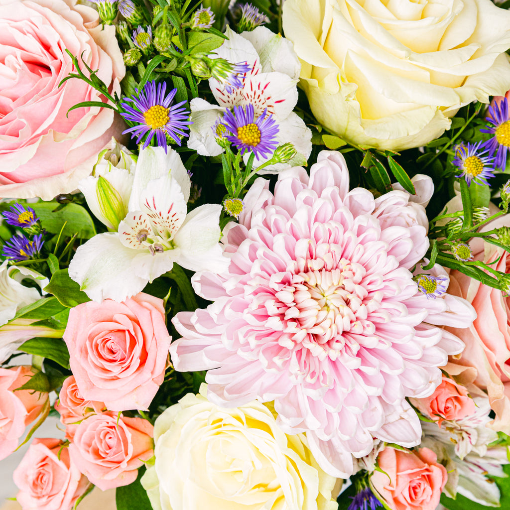 Pastel tonlar huzur ve dinginlik hissi uyandırır, buket alıcısına sevgi dolu bir destek mesajı verir. Anastasia, Aster ve Beyaz Güllerin birleşimi, zarafeti ve inceliği temsil eder.
