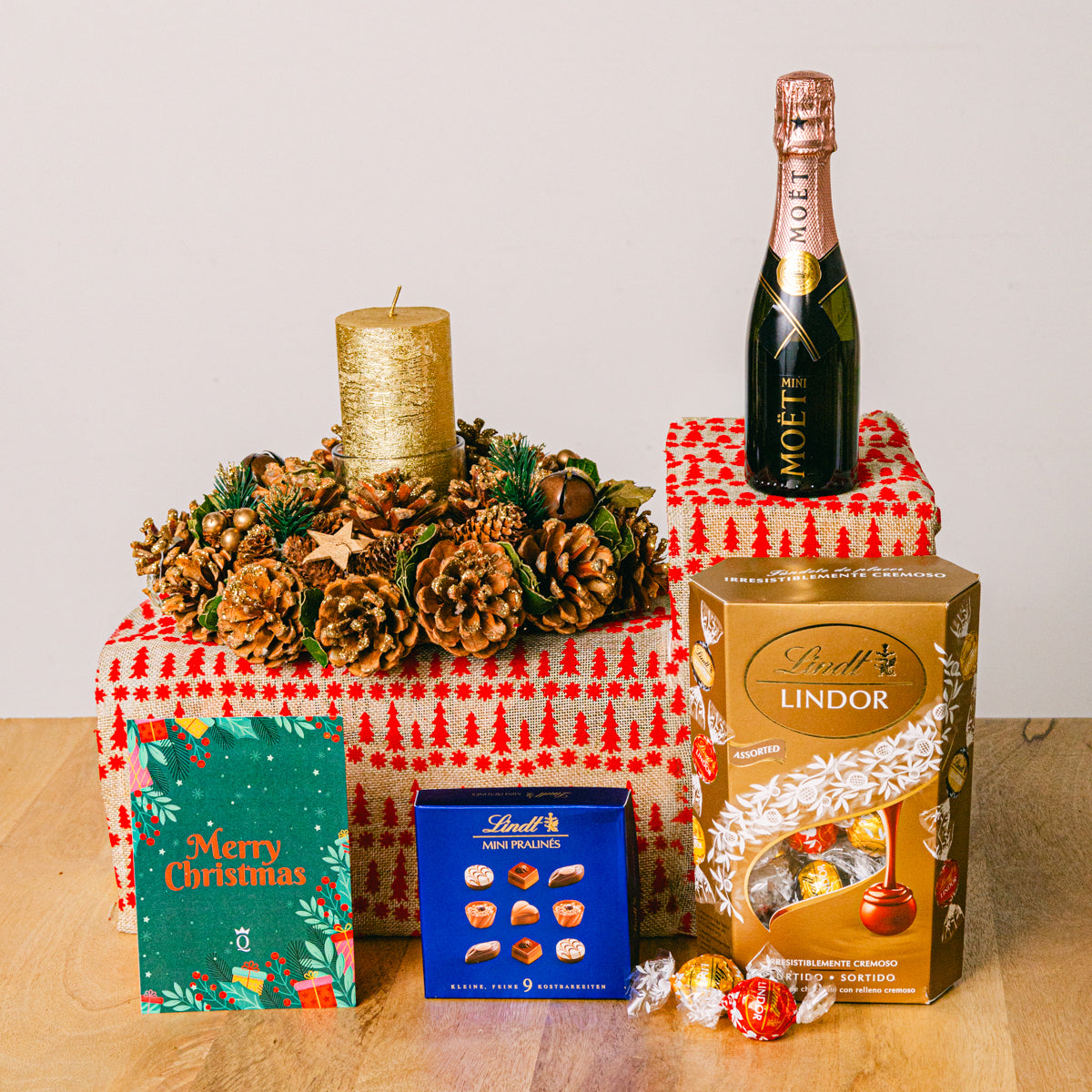 Bu Noel, bu nefis tatlı yılbaşı sepetiyle yeni yıl tebriklerinizi bambaşka bir şekilde gönderin. İçinde çeşitli çikolatalı lezzetler, ağızda eriyen bisküviler ve özel birinin kutlamasına yardımcı olmak için mükemmel bir mini şişe köpüklü şarap bulunuyor. Bu hediye ayrıca, gerçek yapraklı geleneksel bir Noel çelengi ve alıcınız için kişiselleştirebileceğiniz bir Noel kartı da içeriyor. Hediye içeriği: Noel kartı Lindt Mini Pralin 44g Noel Çelengi, masa ortası parçası Mini Moet Rosé 20cl Lindor Kornet 337g