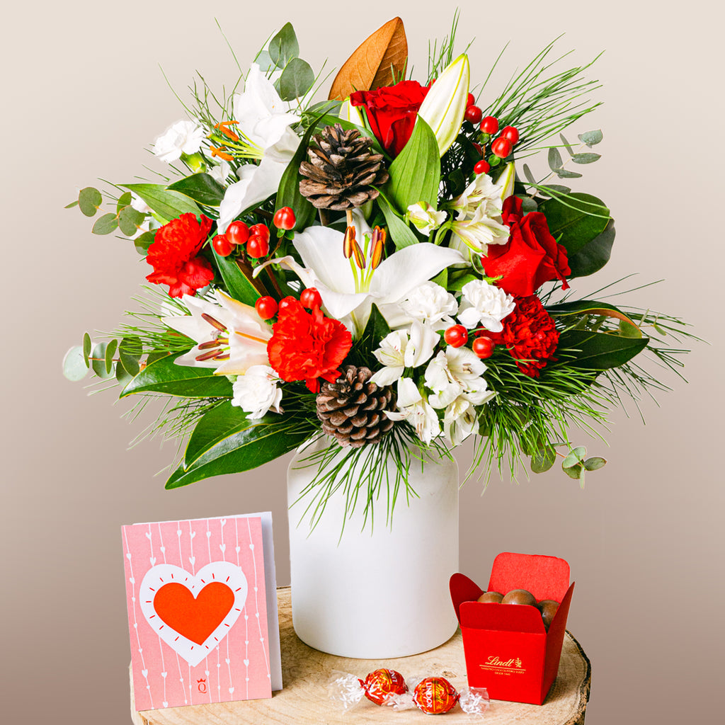 Arkadaşlarınıza veya ailenize bu muhteşem, umut ve tazelik dolu buketle Mutlu Yıllar dilemekten daha iyi bir yol var mı? Beyaz oryantal zambaklar ve karanfiller, kırmızı güller ve kantaron meyveleri, taze kış yeşillikleriyle birlikte yeni başlangıçları simgeleyen tüm renkleri temsil ediyor. 2025'in gelişini kutlayan bir merkez parçası için mükemmel, etkileyici ve hoş kokulu bir sunum.